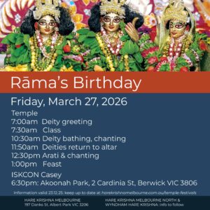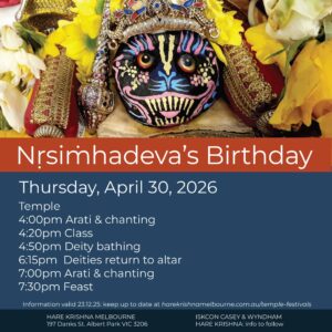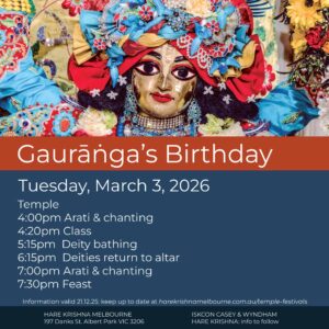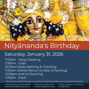 For those of you in Inner Melbourne, Hare Krishna Melbourne (197 Danks St, Albert Park 3206) invites you to celebrate Janmastami from 4:30 am Saturday, August 16, till 1:00 am, Sunday, August 17. As usual, you can enjoy extended darshanas of Sri-Sri Gaura-Nitai, Radha-Vallabha, and Jagannatha-Baladeva-Subhadra, attend the scheduled aratis, and chant and dance in the day-long transcendental kirtanas. You can have an arati tray offered to Sri Krishna on your behalf, or sponsor an abhisheka kalasha (also to be offered on your behalf). Free Krishna prasadam will be served throughout the day. Don’t forget the beautiful candle-lit midnight arati marking Krishna’s Appearance.