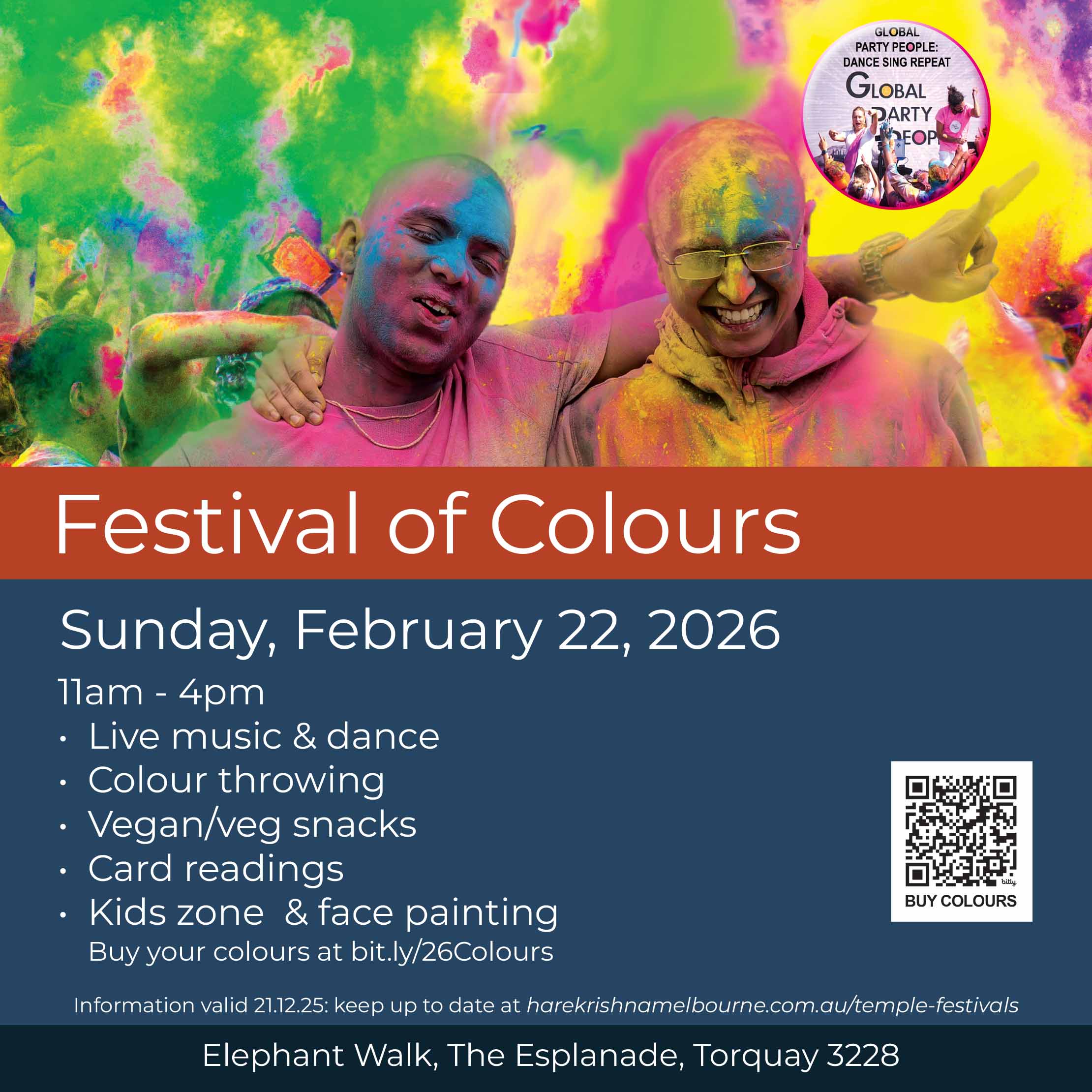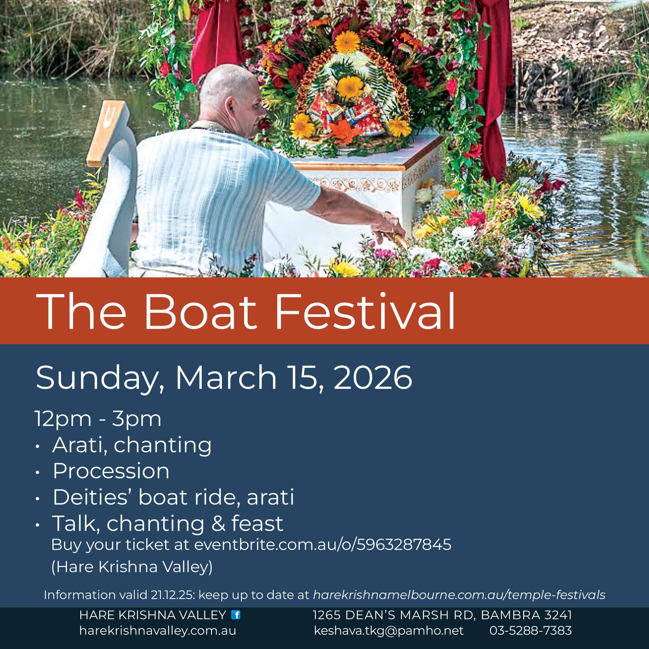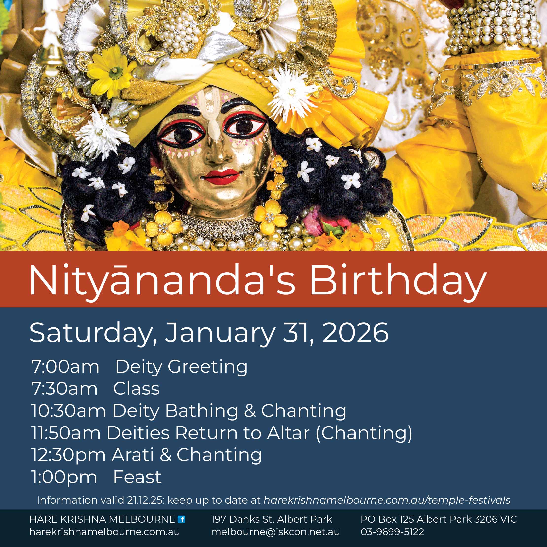 Where (2025): Hare Krishna Melbourne in Albert Park, and venues in Epping, Berwick, and Werribee.