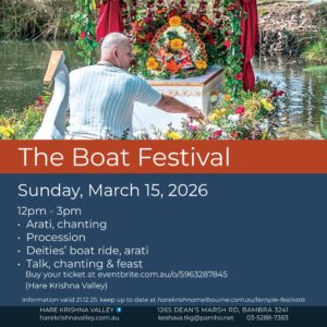 ISKCON Casey is bringing Janmastami to the South-eastern Suburbs. You can celebrate with us from 5 pm till 12 am at the Akoondah Park Centre (2 Cardinia St, Berwick 3806). Beautiful Radha Bansi-Bihari will give Their darshana. There’ll be a Jhulan (swing) for the Lords’ pleasure, cultural performances, personal puja offerings, kirtanas, and delicious prasadam, and more. Casey Janmastami is supported by the Victorian State Government. Get more info and complete your free registration at tinyurl.com/RegKJ25.