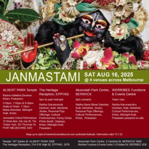 ISKCON Casey is bringing Janmastami to the South-eastern Suburbs. You can celebrate with us from 5 pm till 12 am at the Akoondah Park Centre (2 Cardinia St, Berwick 3806). Beautiful Radha Bansi-Bihari will give Their darshana. There’ll be a Jhulan (swing) for the Lords’ pleasure, cultural performances, personal puja offerings, kirtanas, and delicious prasadam, and more. Casey Janmastami is supported by the Victorian State Government. Get more info and complete your free registration at tinyurl.com/RegKJ25.